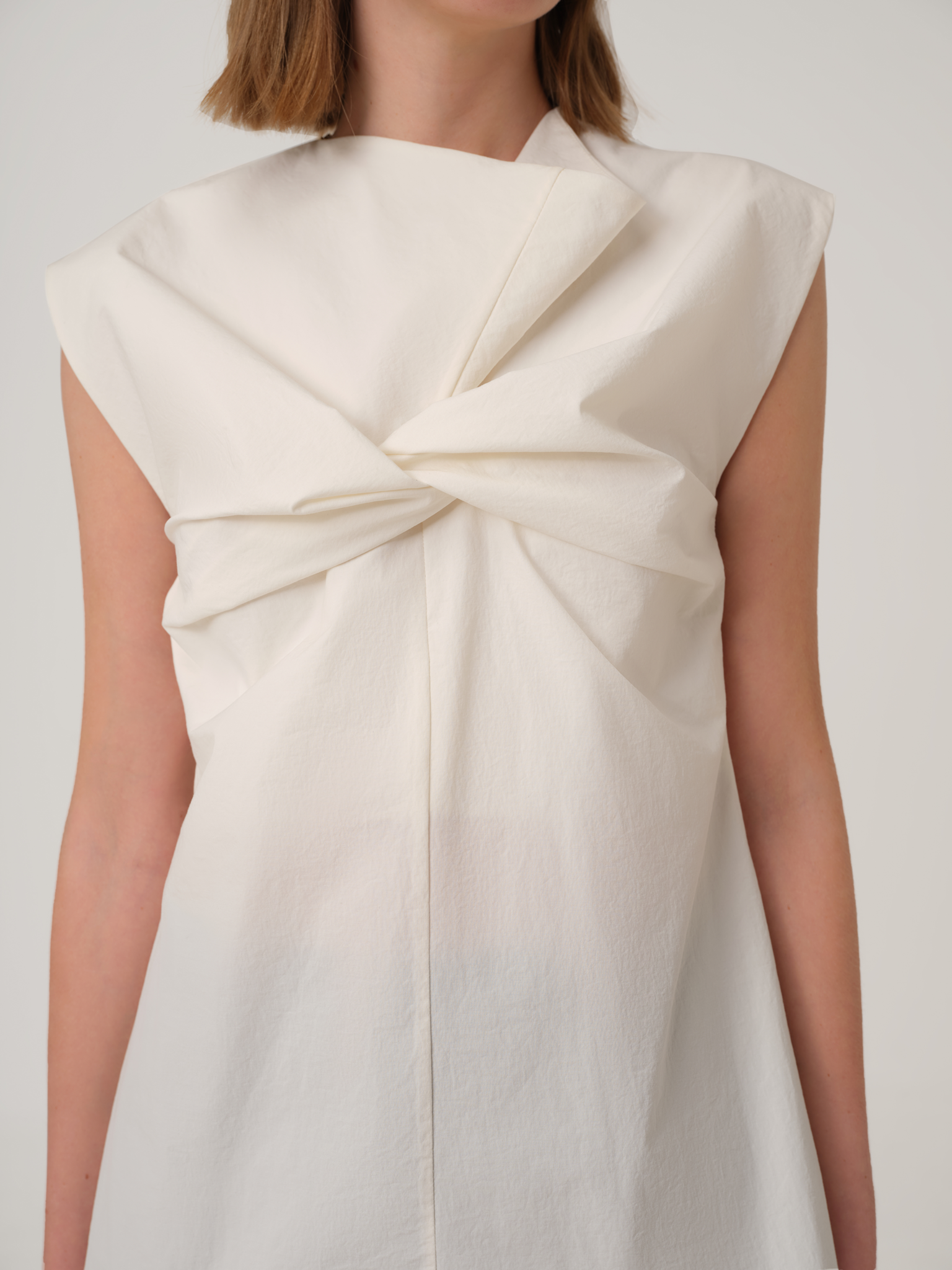 Relaxed fit sleeveless blouse with cowl neck detail and twisted at bustline.