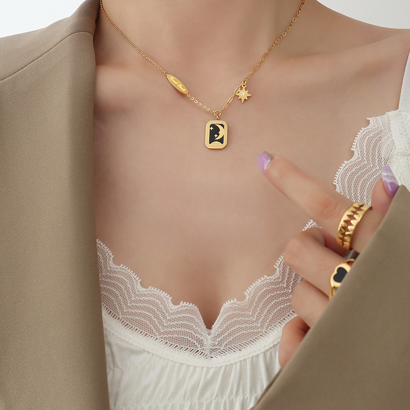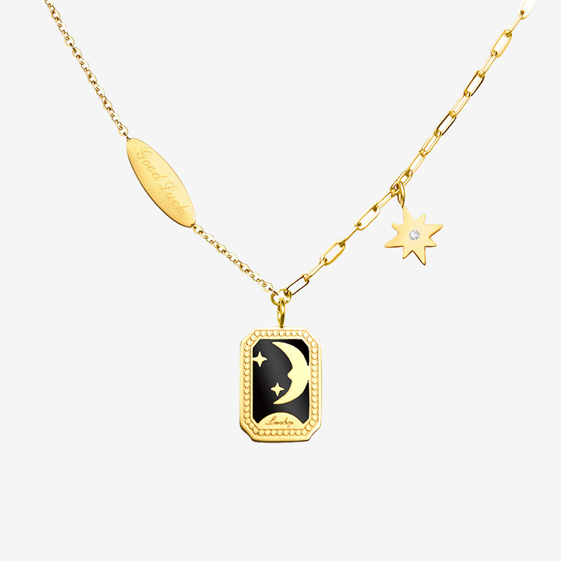 Stars & Moon Square Plate Lucky Pendant Necklace