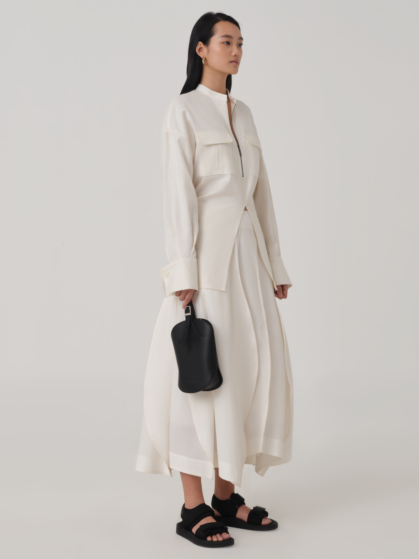 Comes with a mandarin collar and a metal zipper at the front, this shirt has long sleeves, oversized cuffs and fastenings at the back.